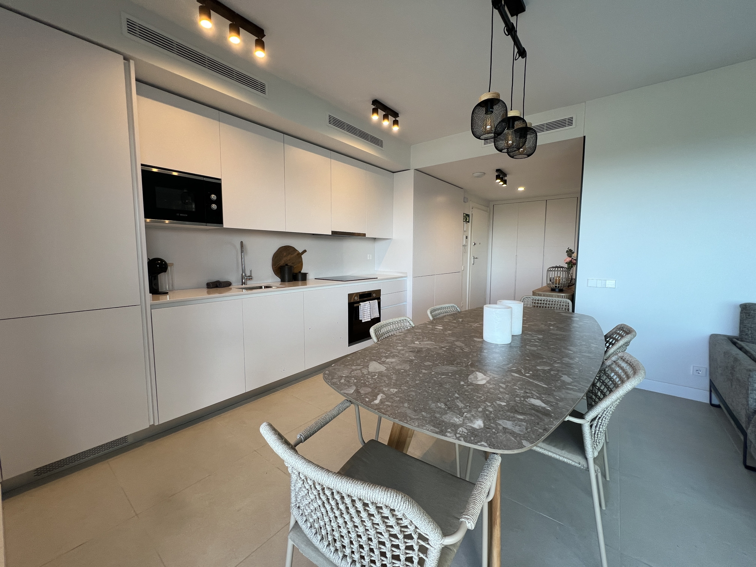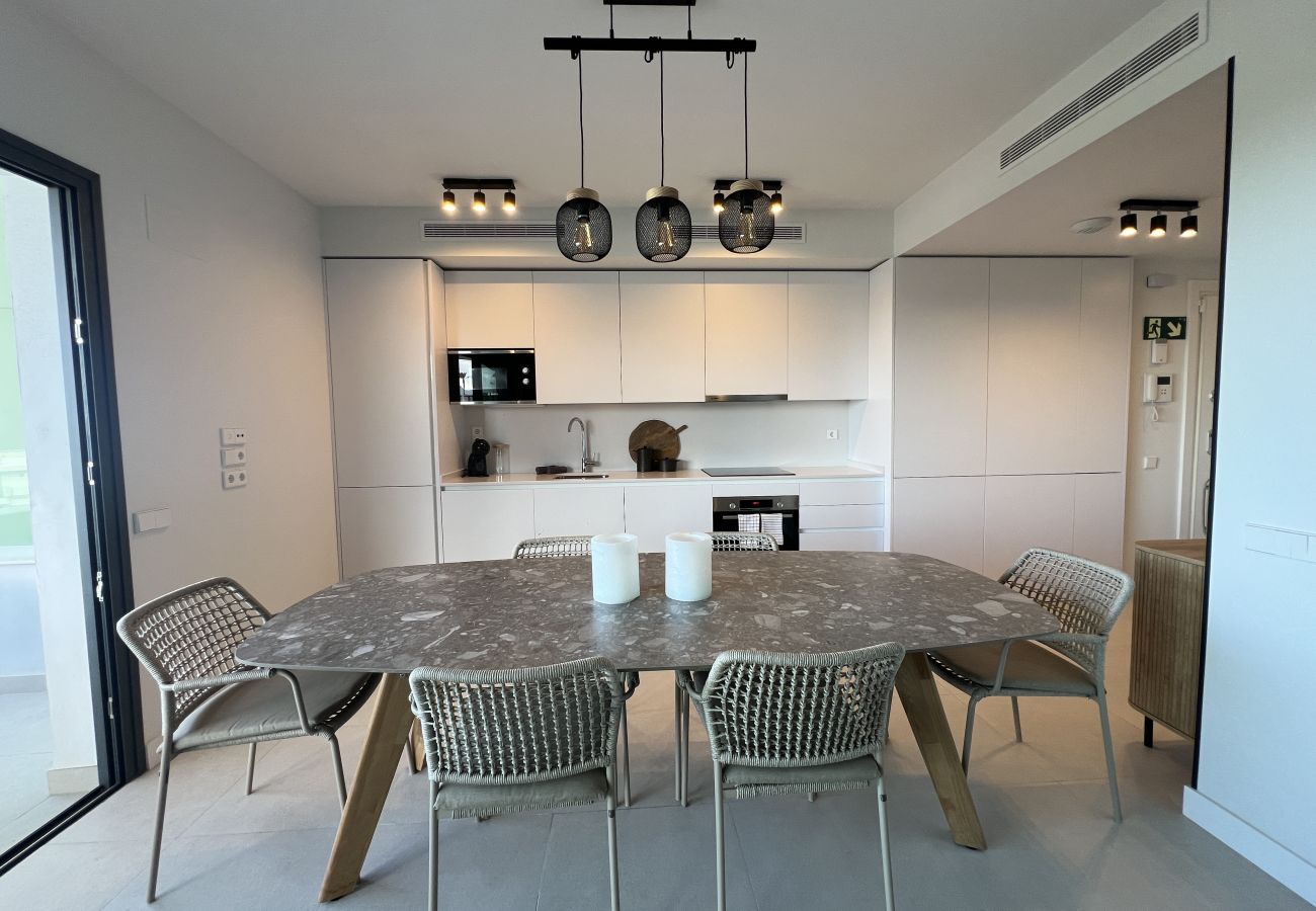 Le grand séjour, avec sa cuisine intégrée moderne, est baigné de lumière naturelle et offre un accès direct à la terrasse, d'où vous pourrez profiter d'une vue imprenable sur la mer et le golf, tout en cuisinant sur la plancha électrique ou en profitant simplement du soleil andalou.