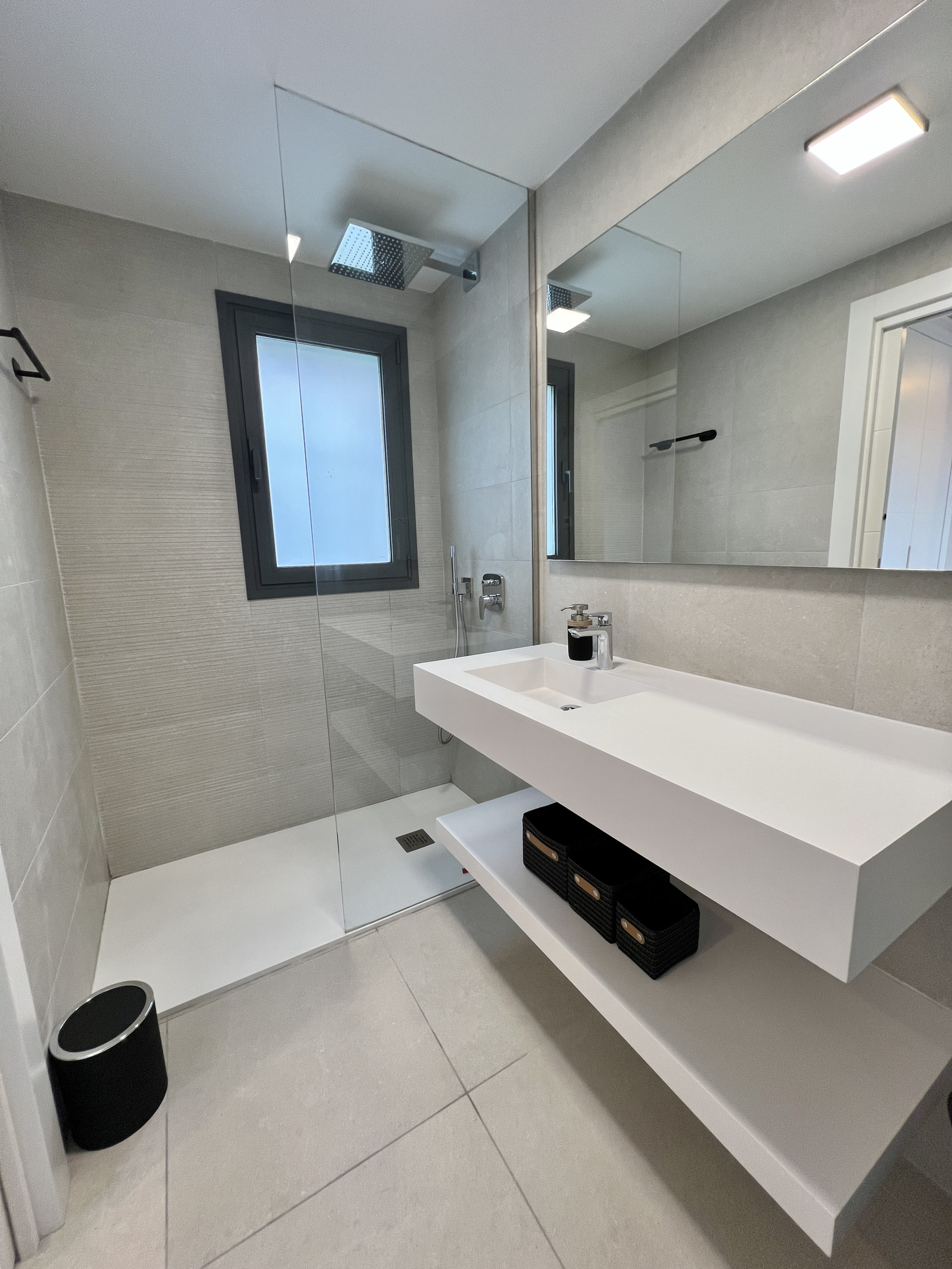 Ce luxueux appartement comprend une suite parentale avec dressing et salle de bain, ainsi que deux chambres à coucher doubles supplémentaires. Les deux salles de bains sont équipées de belles douches à l'italienne avec effet pluie.